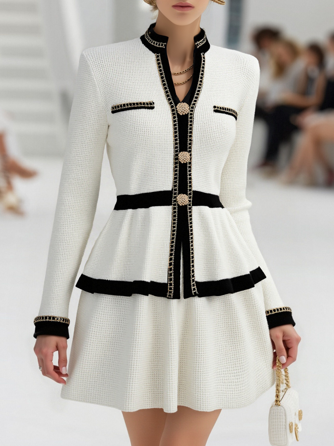 Key Features:1.Material: Exquisite soft and breathable knitted fabric2.Design:Stand collar. long sleeves. decorative trim. pleated skirt3.Fit: Regular fit....