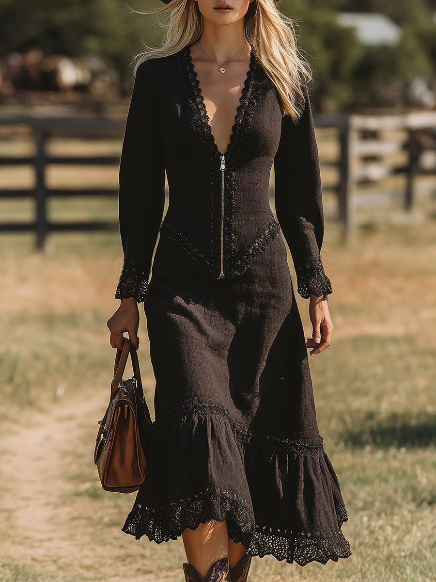 Western-style Black Linen Midi Dress With Lace Patchwork