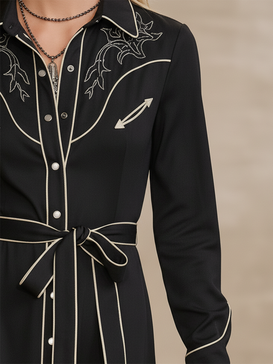 This chic Western‑inspired maxi dress fuses frontier charm with polished sophistication. Crafted from smooth black matte satin. it falls fluidly with a subtle sheen that catches the light without overpowering its refined texture. Contrasting white stripes add dynamic structure and lengthen the silhouette. while intricate Western embroidery — placed along the bodice or shoulders — introduces artisanal detailing that nods to classic cowboy‑chic heritage. The result is a harmonious blend of bold elegance and subtle rustic flair.