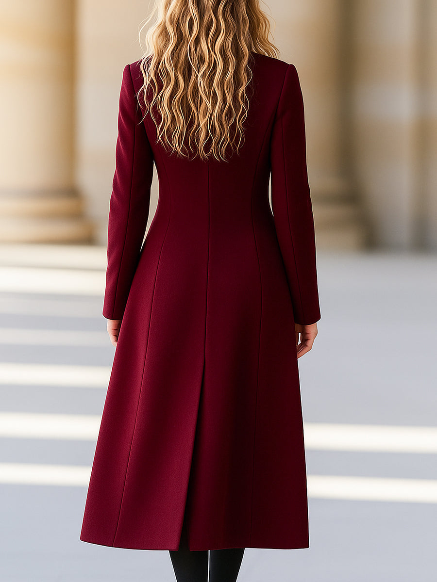 Made from premium fabrics. this coat features a rich burgundy hue that adds warmth and depth to your overall look. The double-breasted design not only enhances the classic appeal. but also provides a fitted cut that cinches in at the waist to accentuate your silhouette. The stylish lapels add a touch of sophistication. perfect for casual outings and formal occasions.